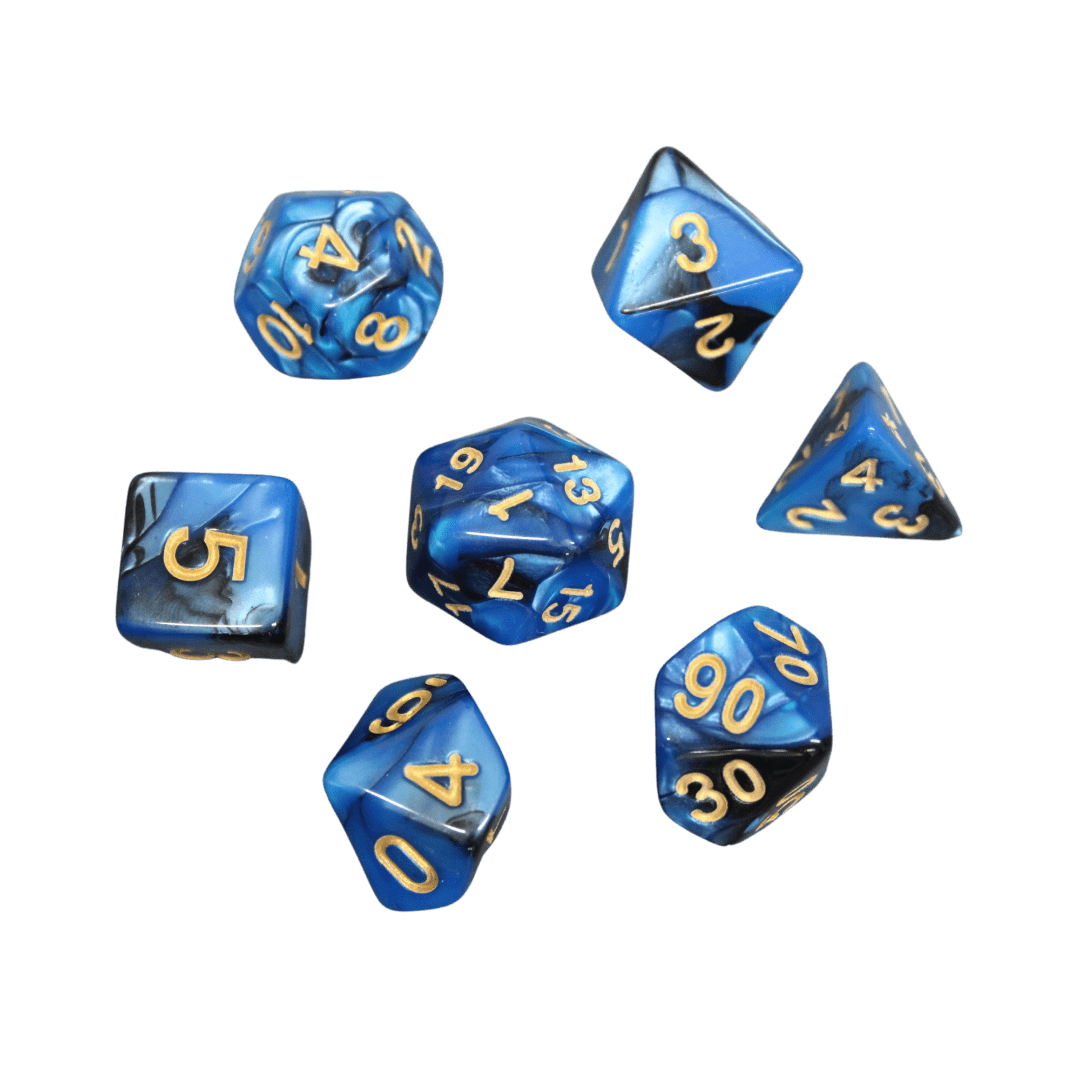Crafted with a marbled blend of cobalt blue and deep swirls, each die captures the look of liquid blue frozen in time. The engraved numbers are bold and easy to read, ensuring precision in every game. Whether you’re casting spells, battling dragons, or exploring dungeons, these dice provide a reliable and stylish companion for every adventure.