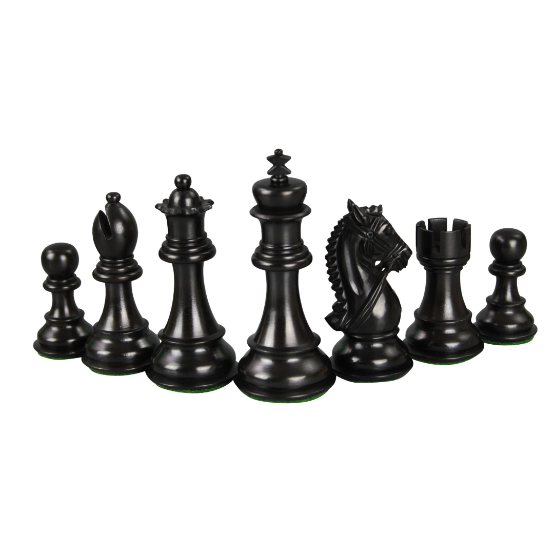 Elevate your surroundings with the essence of perfection embodied in the King Bridal Chess Series, an exceptional assemblage of well-designed and highly intricate chessmen. Setting them apart from the standard Staunton range, these pieces boast masterful carvings achievable only by the most accomplished artisans in Amritsar, India. Among these remarkable pieces, the Knight stands as the focal point, as is often the case with Staunton range Ebony chess set. Crafting a pair of knights demands over two days of dedicated effort, with no margin for error. The rarity of these pieces lies in the precise timing and skill required for their creation, rendering them truly exceptional.Expertly crafted by highly skilled artisans based in Amritsar, India, these chess pieces are thoughtfully carved and fashioned from solid blocks of wood. Each piece is meticulously weighted to ensure a comfortable and stable gameplay experience. Adorning each piece with a soft green felt layer not only adds protection for your cherished chess board but also underscores the attention to detail.