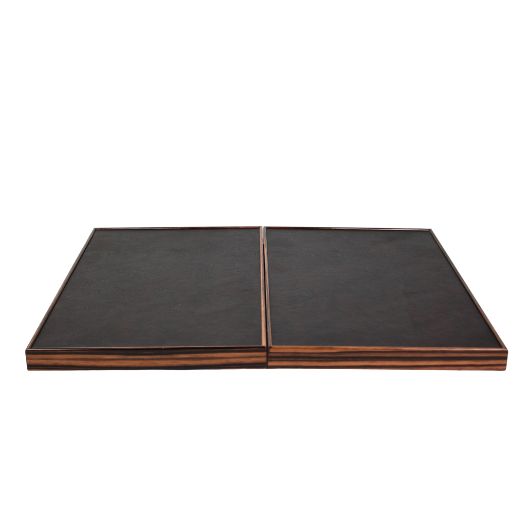 Our Leather Regal Backgammon sets are crafted using top-quality materials for durability and style. The main and surface materials are made of 12mm and 4mm First Quality Medium Density Fiber (MDF) Boards, ensuring a rigid shape.After profiling and measuring, the MDF parts are wrapped with PU glue and wood-decorated or plain-colored alkorcell foils. Motifs and patterns are applied to genuine leather-textured artificial leathers using textile printing machines, then adhered to the MDF surfaces with polyurethane adhesive.Decorative metal locking clips are added, and the set is boxed for delivery. The prints on the surfaces resist cologne, detergent, soap, sweat, and friction, but are susceptible to pure alcohol and acetone.Playing chips are made of polygol glossy polyester in various colors, with optional accessories like plastic, acrylic, or polyester chips, larger dices, doubling cubes, and shakers for dices, depending on the model.With quality materials and attention to detail, our Leather Backgammon sets offer both durability and elegance for endless enjoyment.