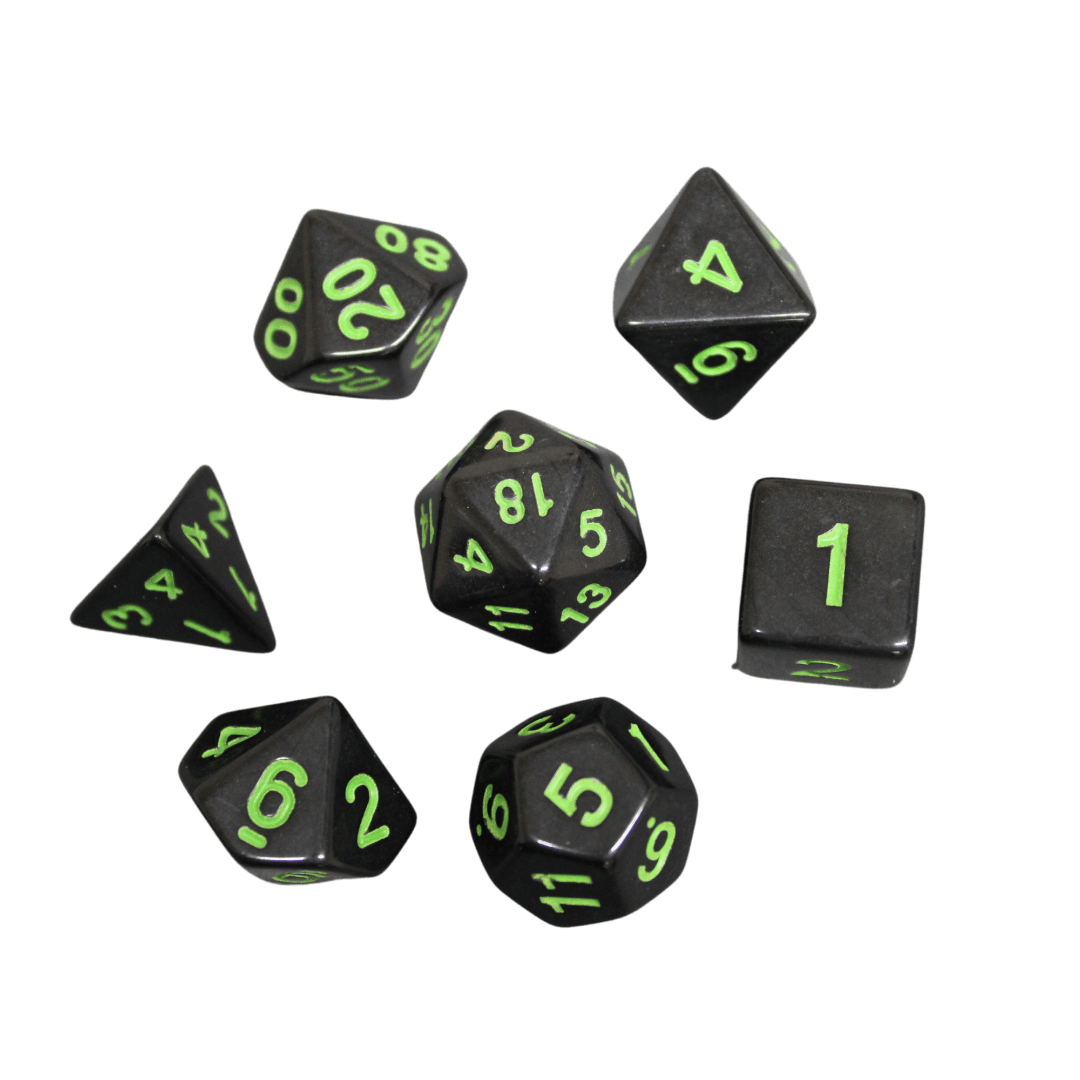 The Midnight Black & Neon Green Marbled DND Dice Set. This striking 7-piece set is designed for tabletop role-playing games, adding an air of mystery and elegance to every roll.