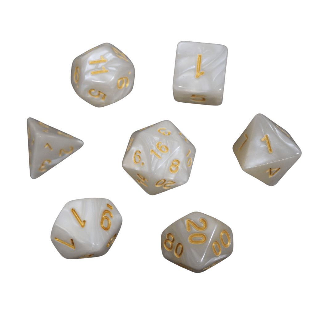 Crafted with a marbled blend of Pearl White and deep swirls, each die captures the look of liquid gold frozen in time. The engraved numbers are bold and easy to read, ensuring precision in every game. Whether you’re casting spells, battling dragons, or exploring dungeons, these dice provide a reliable and stylish companion for every adventure.