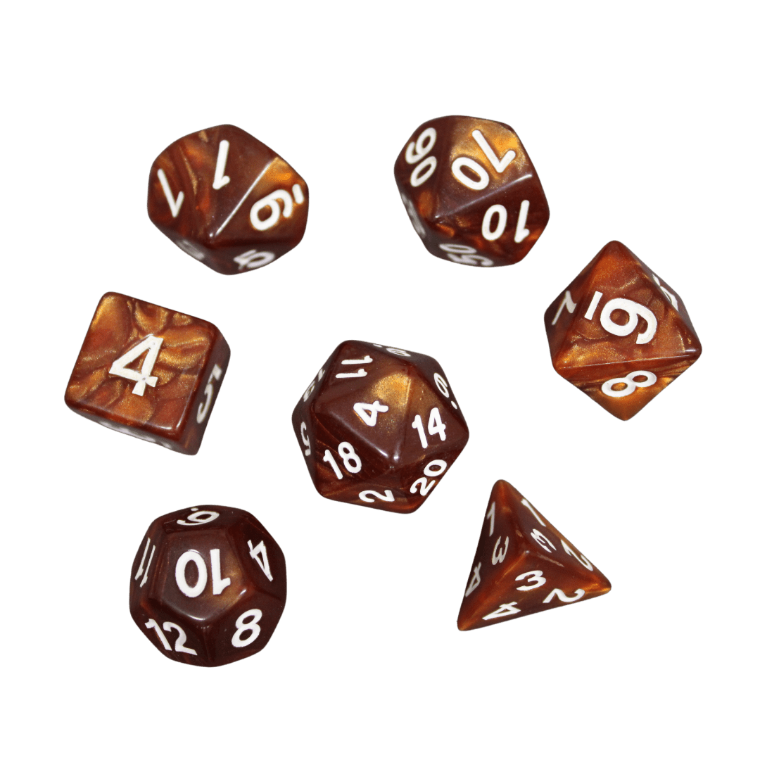 Crafted with a marbled blend of Rustic Brown and deep swirls, each die captures the look of liquid gold frozen in time. The engraved numbers are bold and easy to read, ensuring precision in every game. Whether you’re casting spells, battling dragons, or exploring dungeons, these dice provide a reliable and stylish companion for every adventure.