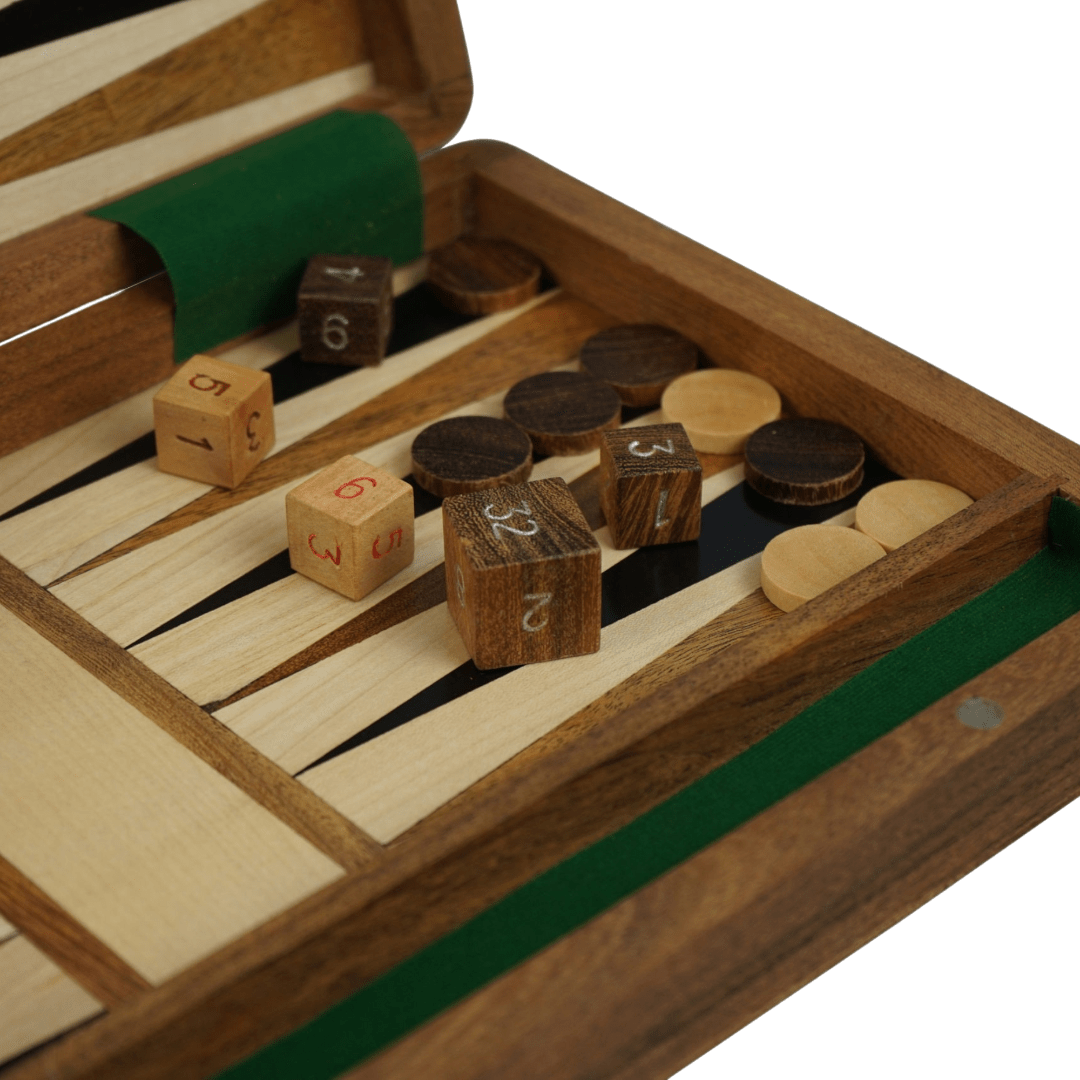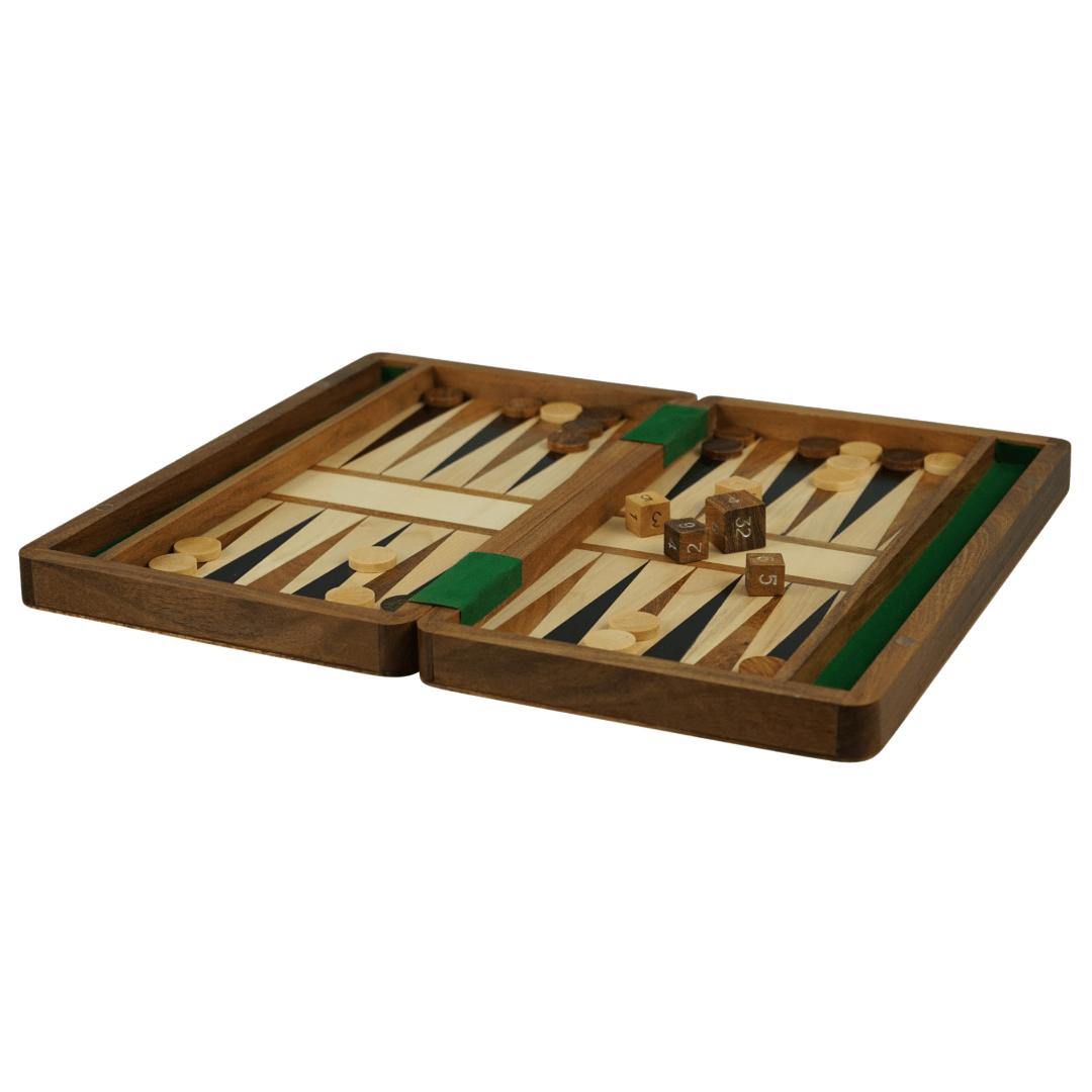 Introducing the Solid Sheesham Backgammon Set, a 14-inch masterpiece that showcases the unparalleled beauty of natural sheesham wood. Meticulously inlaid by highly skilled craftsmen, each piece of wood is delicately placed with meticulous precision and dedication. Elevating its aesthetic appeal, soft padded green felt gracefully covers the hinges, resulting in a simple yet stunning finish. Not only is this backgammon set a testament to craftsmanship, but it also features a pair of magnets discreetly engraved on either side. These magnets ensure a secure closure, holding your sheesham backgammon pieces together and keeping them ready for your next game. Immerse yourself in the exquisite artistry and timeless charm of the Sheesham Backgammon Set, a true celebration of craftsmanship and quality.