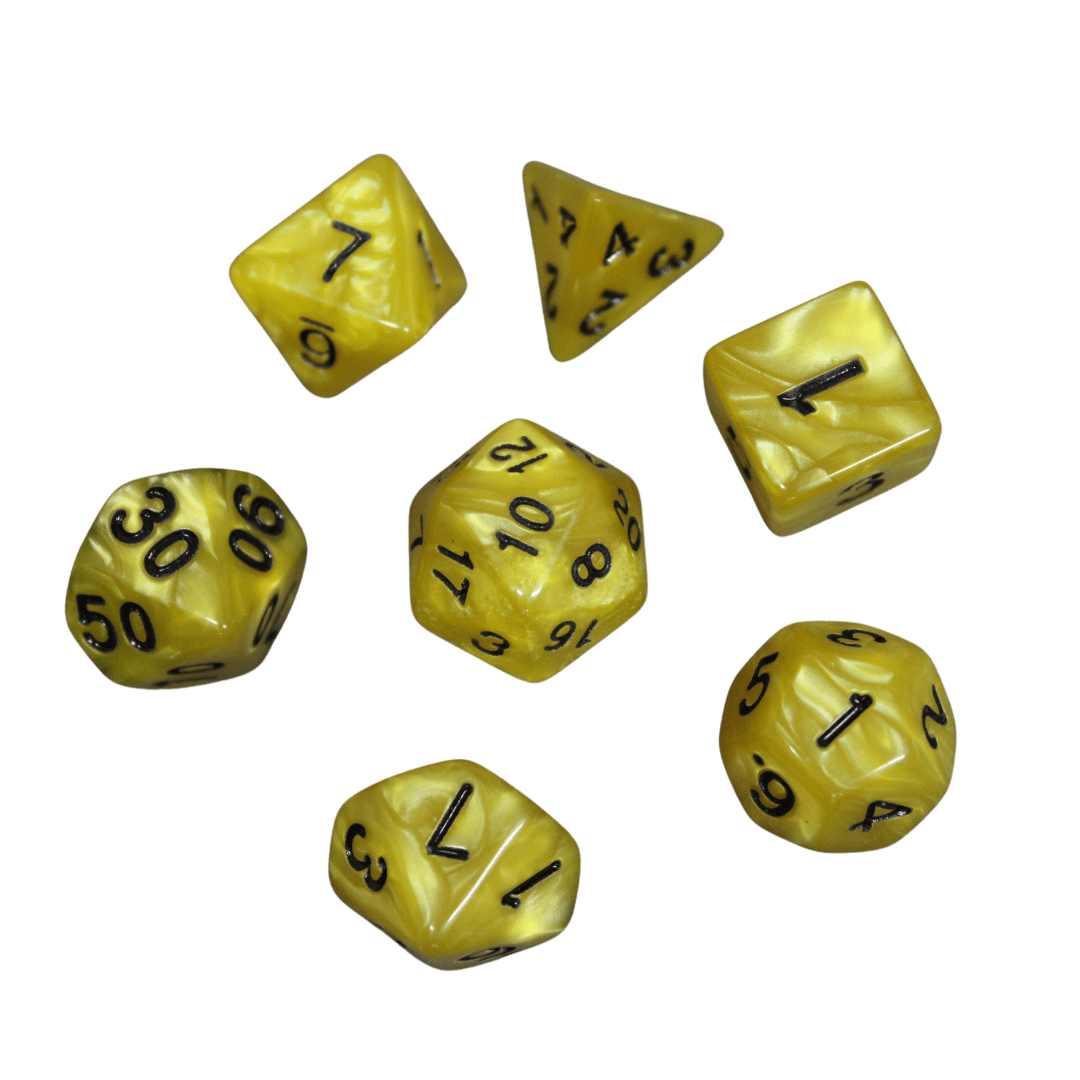 Crafted with a marbled blend of Tuscany Yellow and deep swirls, each die captures the look of liquid gold frozen in time. The engraved numbers are bold and easy to read, ensuring precision in every game. Whether you’re casting spells, battling dragons, or exploring dungeons, these dice provide a reliable and stylish companion for every adventure.