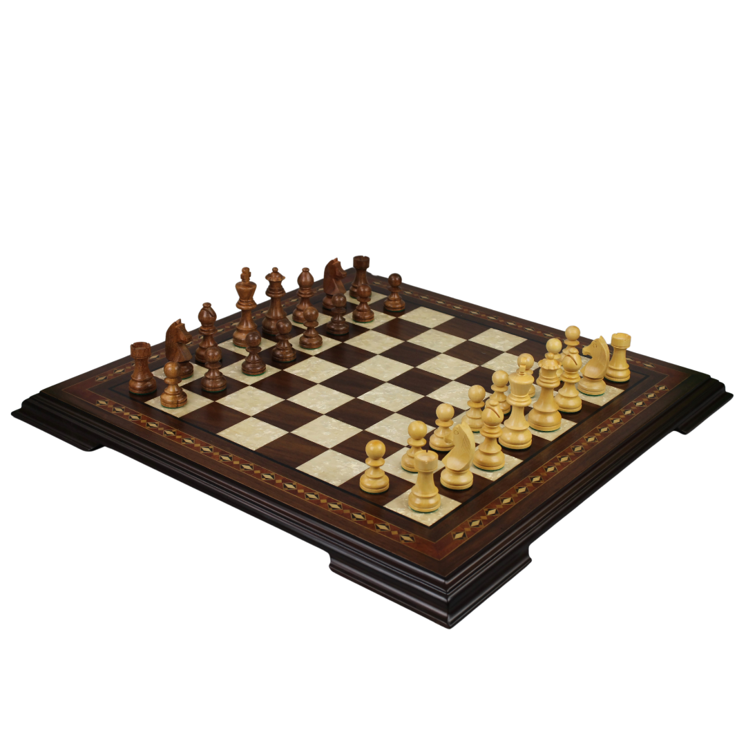 Experience the elegance of the Walnut Chess Set, featuring a solid walnut Helena chessboard adorned with exquisite Mother of Pearl inlays crafted by talented Turkish artists. Influenced by Moorish design elements and geometric patterns, the walnut chess set emanates a captivating charm. The meticulous craftsmanship involves intricate woodwork cuts, scores, and shapes that are meticulously walnut chess set by hand. This walnut set boasts vibrant and captivating colours, with each piece meticulously and masterfully fitted to perfection by the hands of skilled and experienced craftsmen.