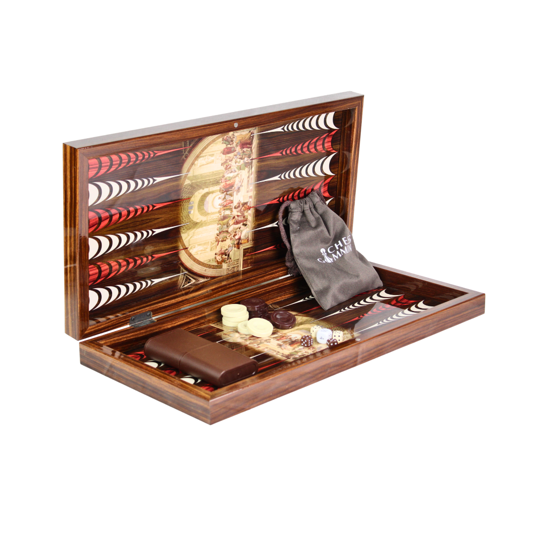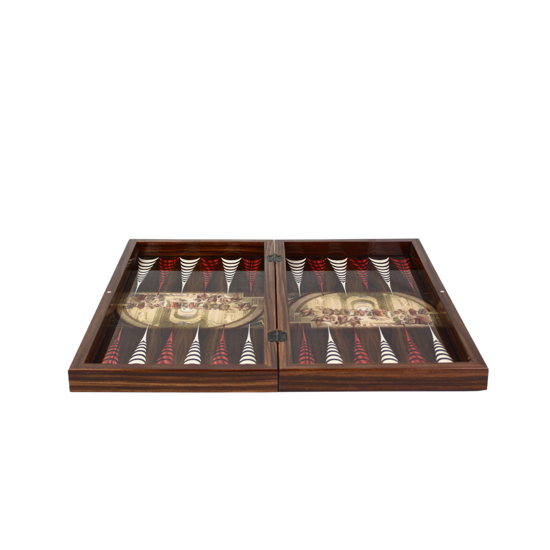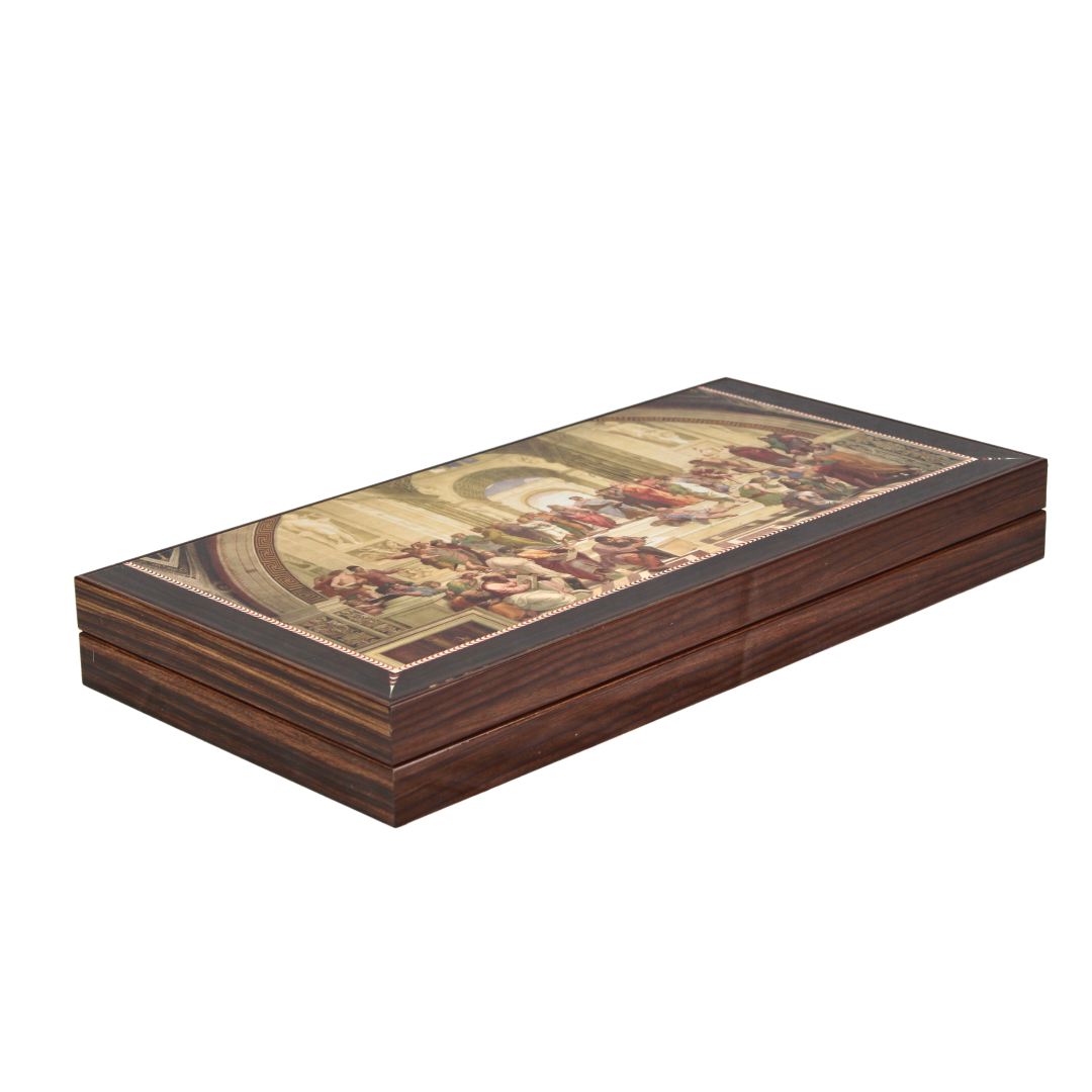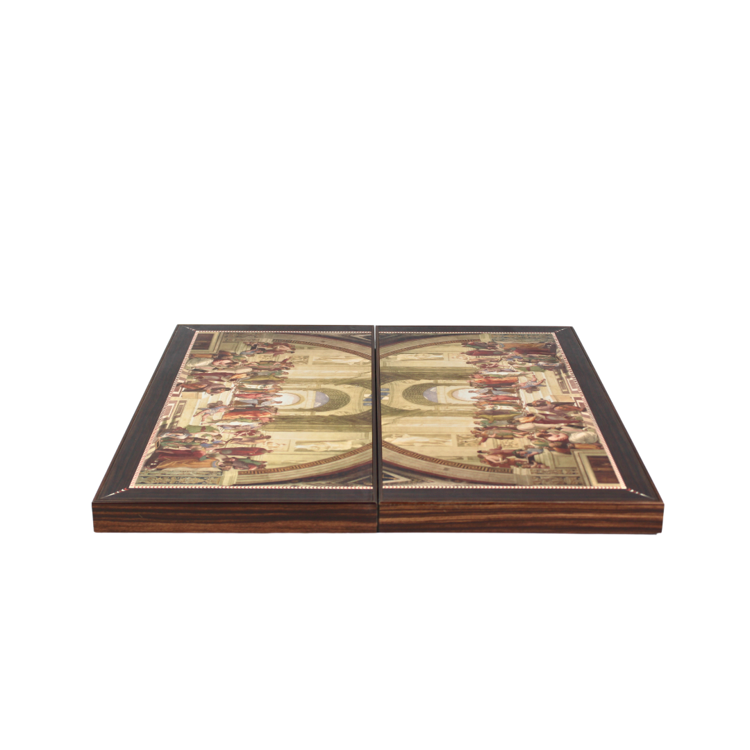 The School of Athens, painted by the renowned Italian Renaissance artist Raphael between 1509 and 1511, stands as one of his most celebrated frescoes. Commissioned as part of Raphael’s project to adorn the Stanze di Raffaello, located within the Vatican’s Apostolic Palace, this masterpiece showcases the intellectual vibrancy of ancient philosophy.Our Artwork & Premium Backgammon sets are crafted with meticulous attention to detail. The main frames are constructed from high-quality 16mm and 4mm MDF boards to ensure durability and maintain the rigid form of our products. These MDF parts undergo profiling into various shapes and sizes before being wrapped with PU glue and wood-decorated High-Gloss PVC foils, consistent with the product types.The playing surfaces, both inner and outer, are coated with a High Glossy (95%) Acrylic UV Cured Varnish, which is non-yellowing, solvent-free, and odorless, providing a luxurious finish. We’ve replaced traditional metal clips with high-grade Neodymium Magnets for secure closure.Additionally, our sets offer optional accessories such as plastic, acrylic, and polyester chips, larger dices, doubling cubes, and dice cups, tailored to suit different product models. With these premium materials and thoughtful design, our Backgammon sets promise both elegance and durability for an exceptional gaming experience.