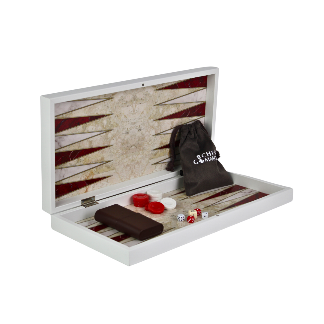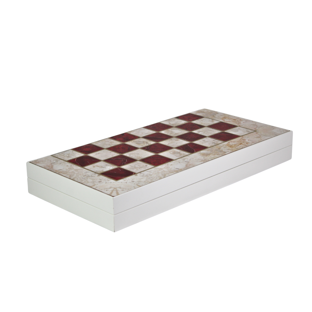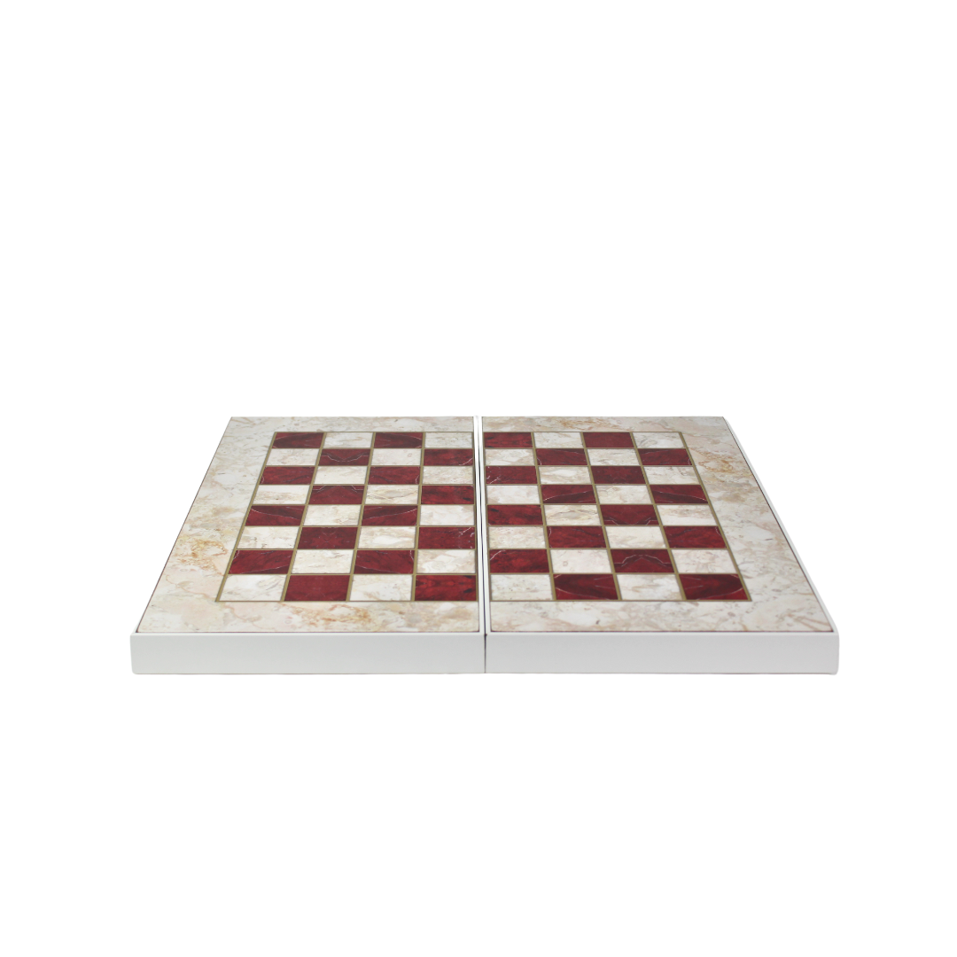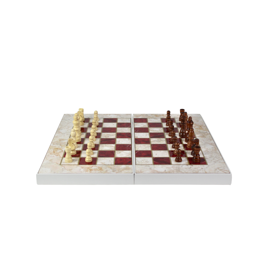 For our Classic Red Marble Chess & Backgammon sets, we prioritize both quality and durability in their construction. The main frames are crafted from 12mm and 4mm First Quality MDF Boards, ensuring they maintain their rigid shape and form over time.Following profiling into various forms and measurements, the MDF parts undergo a wrapping phase with PU glue. The wrapping includes wood-decorated or plain colored alkorcell foils, consistent with the specific product types, enhancing their aesthetic appeal.The inner and outer playing surfaces are treated with a High Glossy (95%) Acrylic UV Cured Varnish. This coating is non-yellowing and free from solvents, smells, and vapors, ensuring a pristine and durable finish.To secure the set, we’ve replaced traditional metal clips with high-grade Neodymium Magnets, offering a reliable closure.Additionally, our sets offer optional accessories such as plastic, acrylic, and polyester chips, larger dices, doubling cubes, and dice cups, depending on the specific product models. With these features, our Classic Chess & Backgammon sets provide a timeless combination of elegance and functionality for an enjoyable gaming experience.